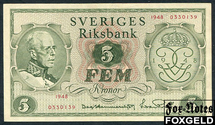 Швеция Sveriges Riksbank 5 крон 1948 XF-aUNC P:27l 0330139