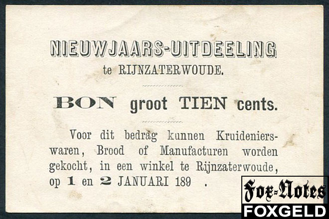 Нидерланды Rijnzaterwoude NIEUWJAARS-UITDEELING 10 центов 1893 aUNC 3000 РУБ