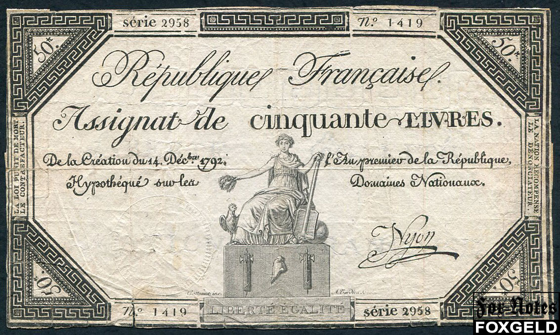 Франция Republique francaise 50 ливров 1792 Подпись - Nyon P:A72 2958№1419