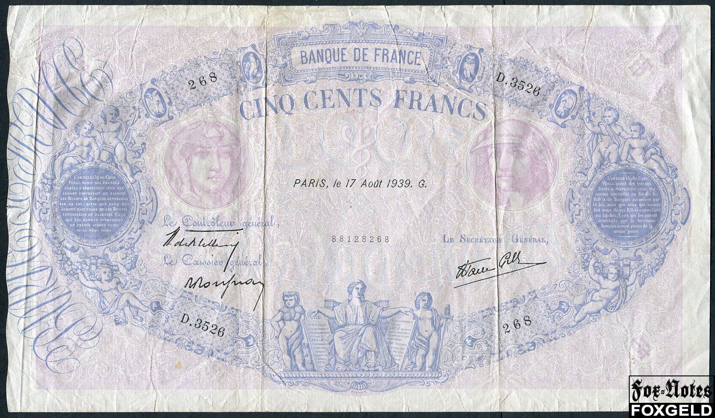 Франция Banque de France 500 франков 1939 Sign. H. de Bletterie Roussean Favre-Gilli. 17=08=1939. aF P:88c 5000 РУБ