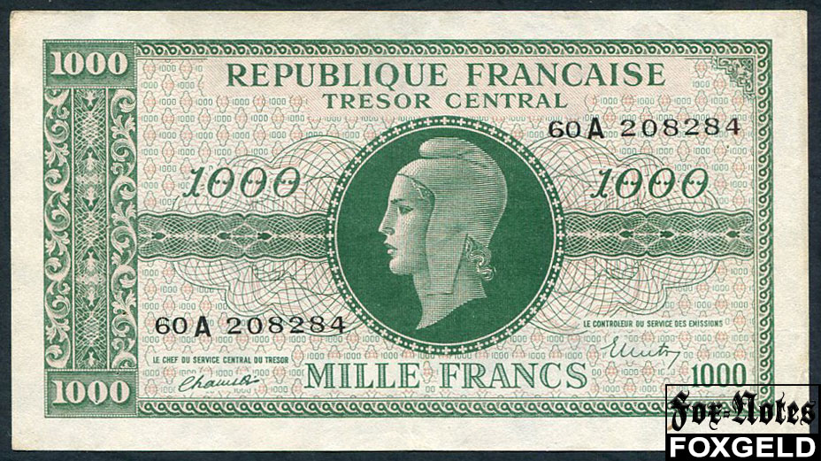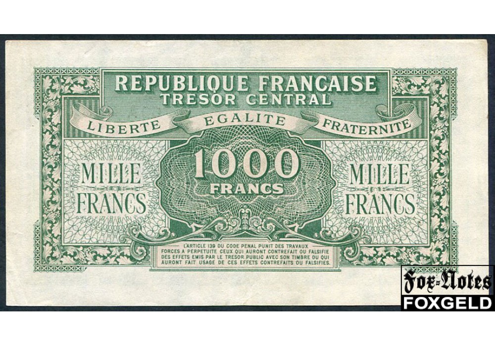 Франция Tresor Central 1000 франков ND(1945) XF P:107 / VF12 8500 РУБ