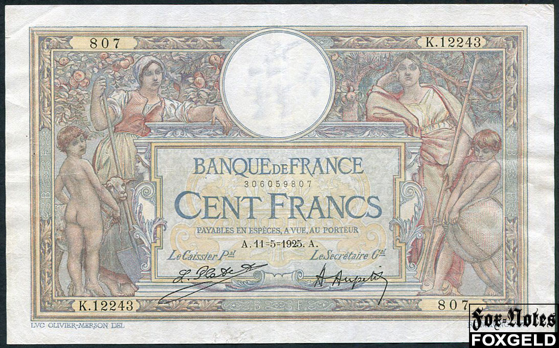 Франция Banque de France 100 франков 1925 Sign. L.Platet A.Aupetit. 11=5=1925 VF P:78a / Fayette 24 3000 РУБ