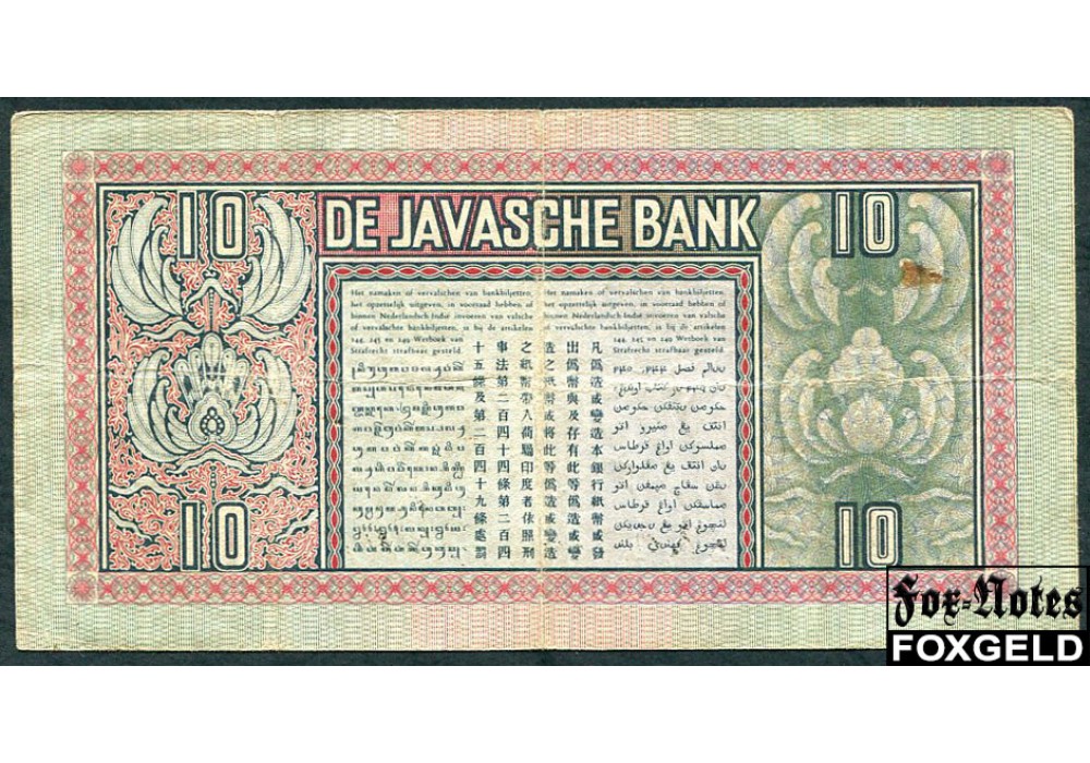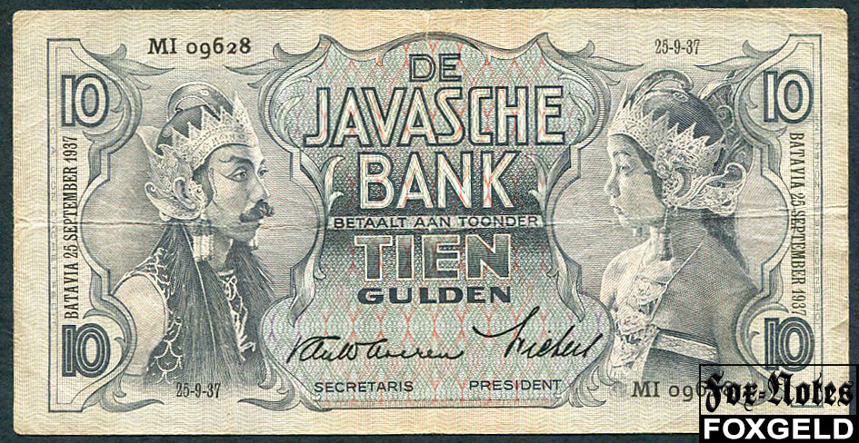 Нидерландская Индия De Javasche Bank 10 гульденов 1937 25-9-37. Sign. J.C. van Waveren, G.G. van Buttingha Wichers F P:79b 8500 РУБ