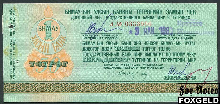 Монголия 50 тугриков ND Дорожный чек русский текст p/h aVF А0333996