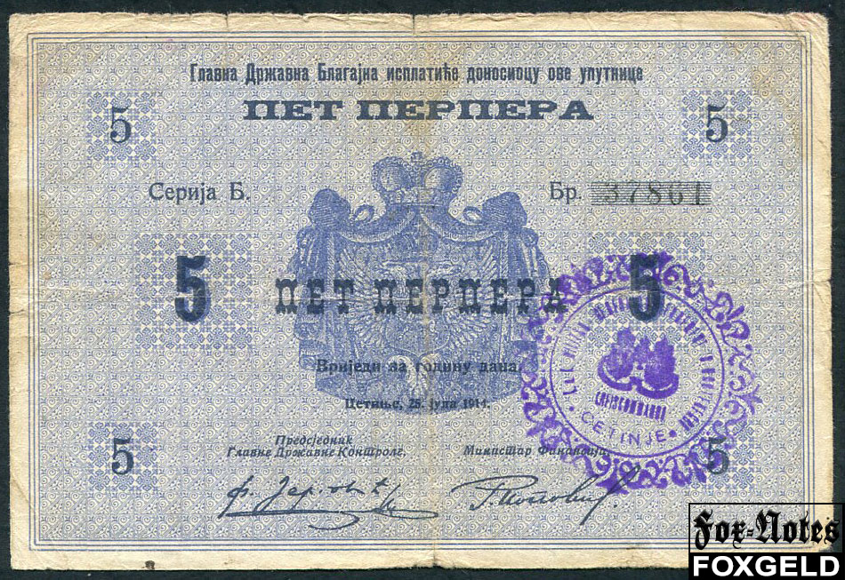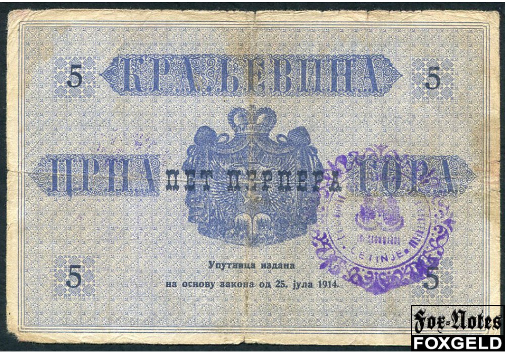 Черногория 5 переперов ND(1916) Штамп CETINJE (16mm) VG-aF P:М13 3200 РУБ