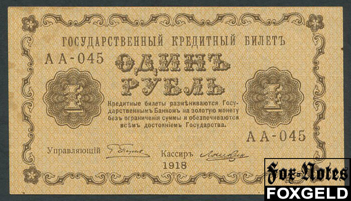 РСФСР 1 рубль 1918 ПФГ. Лошкин XF-aUNC FN:109.1 АА-045