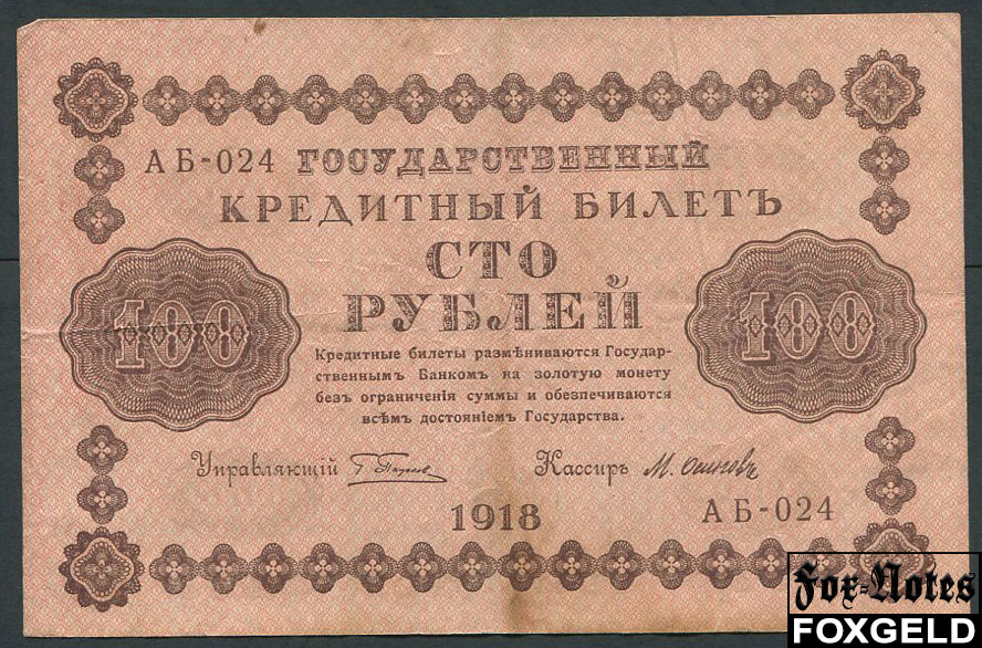 РСФСР 100 рублей 1918 1яМФГ. М. Осипов VF FN:115.1b 350 РУБ