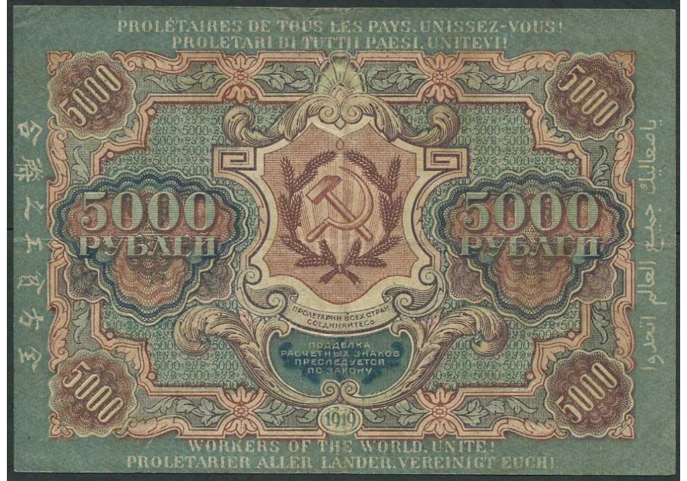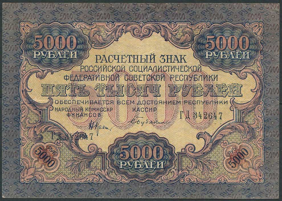 РСФСР 5000 рублей 1919 В/з широкие волны. Бубякин аVF FN:128.1a 2500 РУБ