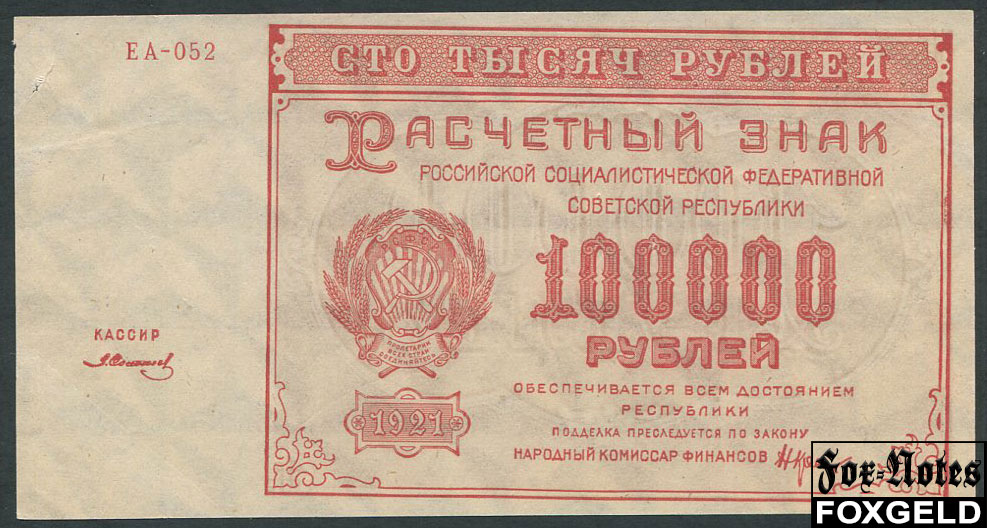 РСФСР 100000 рублей 1921 1яМФГ. Кассир З. Солонинин FN:141.1a 2500 РУБ