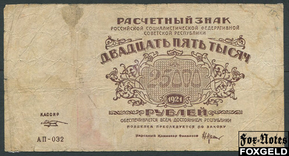 РСФСР 25000 рублей 1921 УФГ. В/з Большие теневые звезды Козлов VG-aF FN:139.1b 2000 РУБ