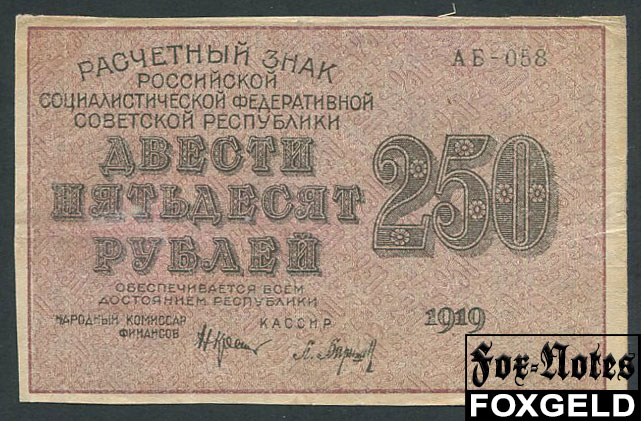 РСФСР 250 рублей 1919 ПФГ. В/з Толстые звезды. Кассир Барышев VF FN:125.1c 5000 РУБ