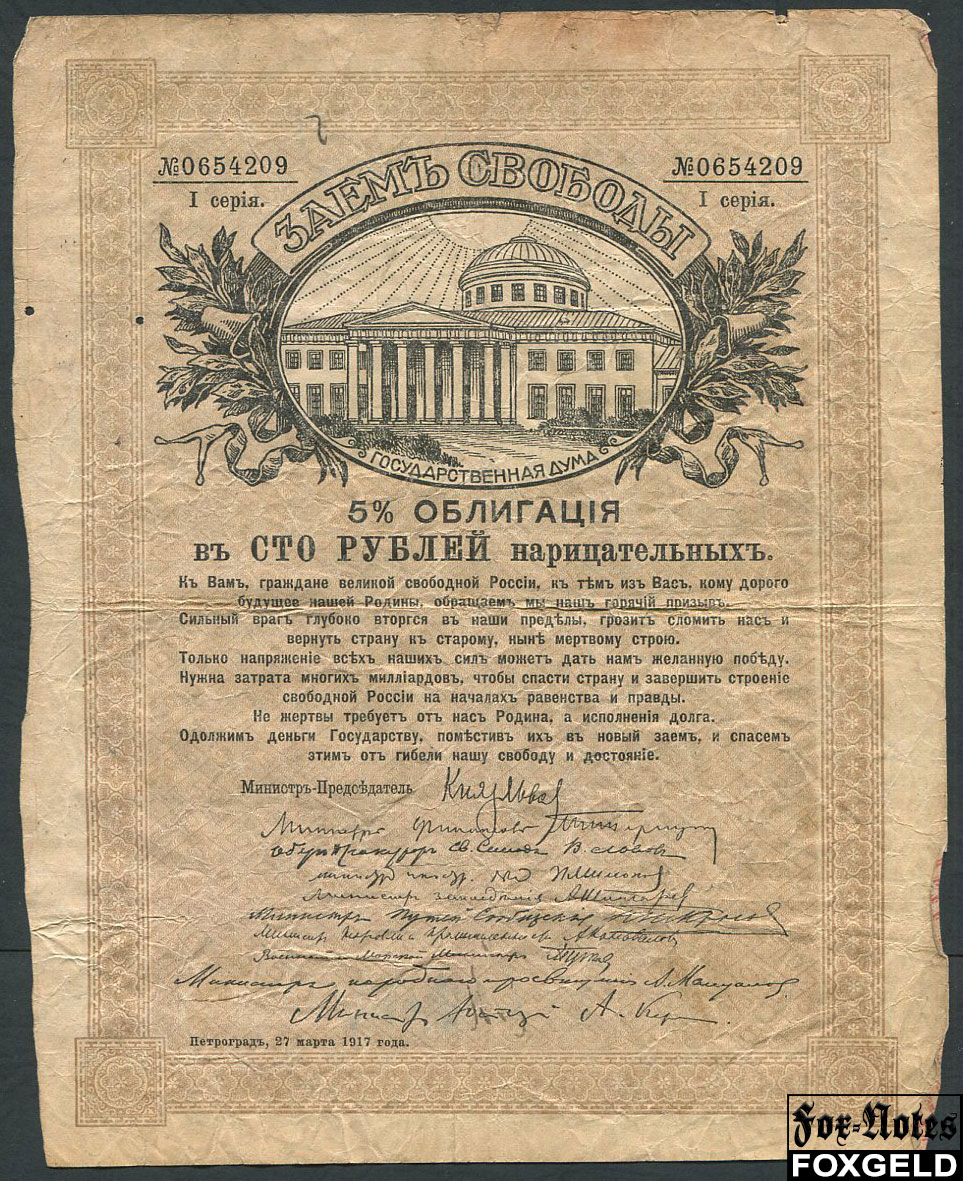 Россия 100 рублей 1917 Заем Свободы Серия I. F FN:К12.1а 500 РУБ