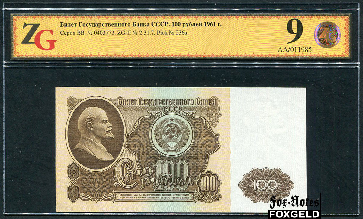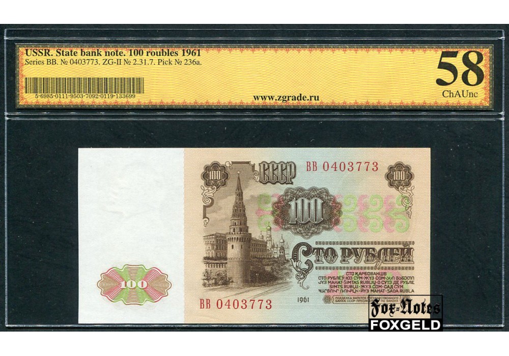 СССР 100 рублей 1961 Слаб ZG. Бумага 2 тип. Серии тип ХХ. 58 ChaUNC FN:225.1b 2500 РУБ